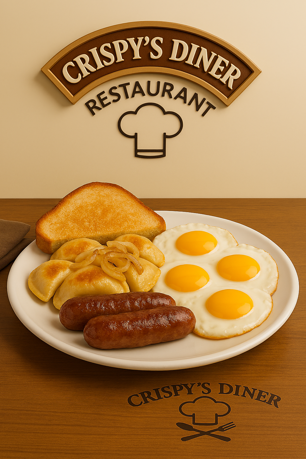 Three Eggs, Six Perogies With Eggs Sausage And Grilled Onion or Bangers and Toast